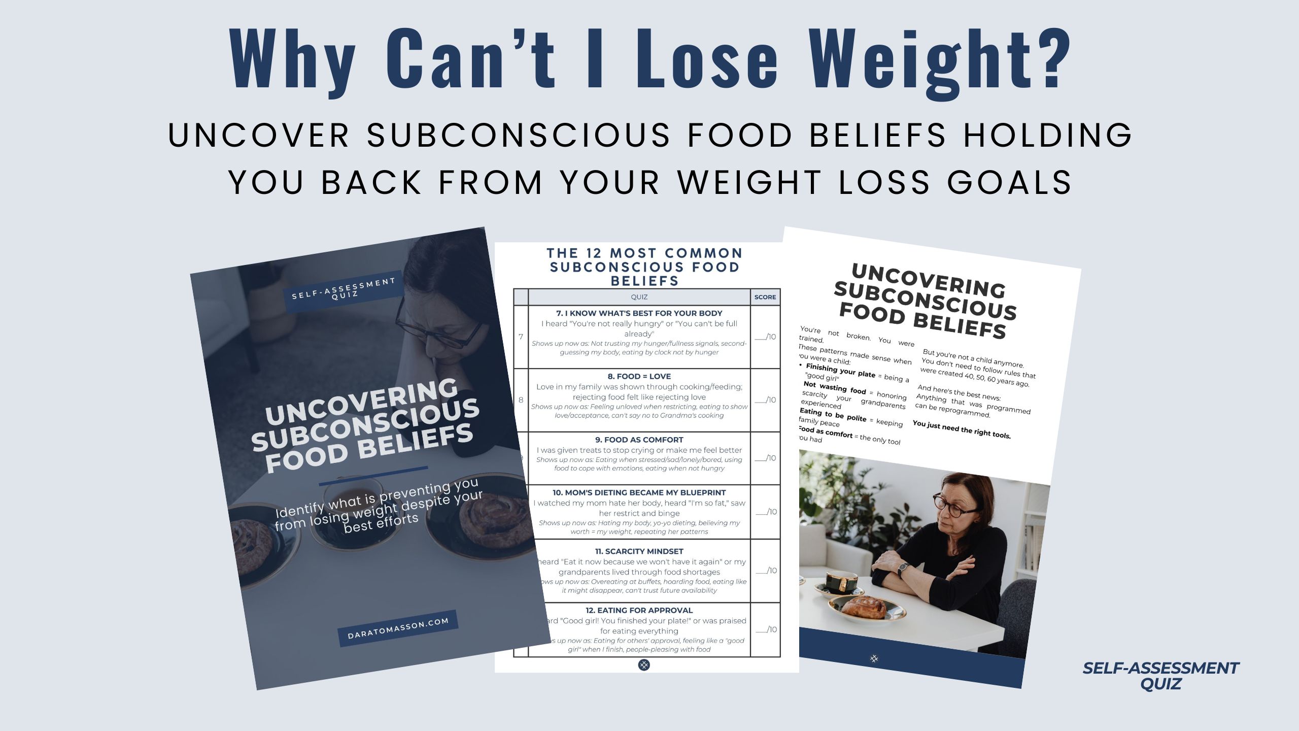 Grab my free self-assessment quiz "Subconscious Food Beliefs Holding You Back from Weight Loss"
